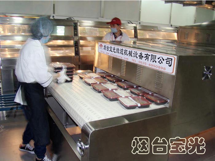 烟台宝光微波机械设备有限公司,根据客户的盒饭产量和场地等要求选型,功率在10—200千瓦。适用企业,学校、快餐公司、餐饮店、赛场、展会等的盒饭配送,其优点是产量高、连续快速,2分钟左右即可达到温度要求。不破坏饭菜的营养成分、不变色、不改变风味。同时,由于加热过程中,微波的热效应和非热效应共同的作用,对饭菜起到了杀菌作用,满足了食品的卫生指标要求。