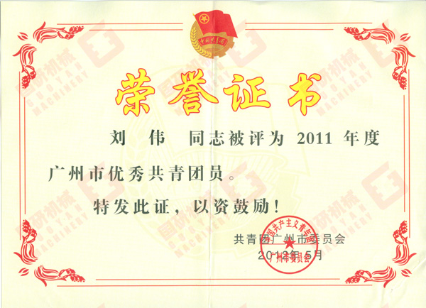 2012年6月,國研機械公司劉偉同志被共青團廣州市委員會評為“2011年度廣州市優秀共青團員”。