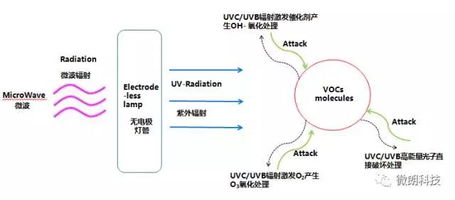 下面本文主要介绍一种新技术“微波光氧催化技术”,通过介绍其原理来说明微波治理VOCs废气的奥秘。微波光氧催化技术对废气的处理实际上是一种复合技术,主要包含以下三个方面: